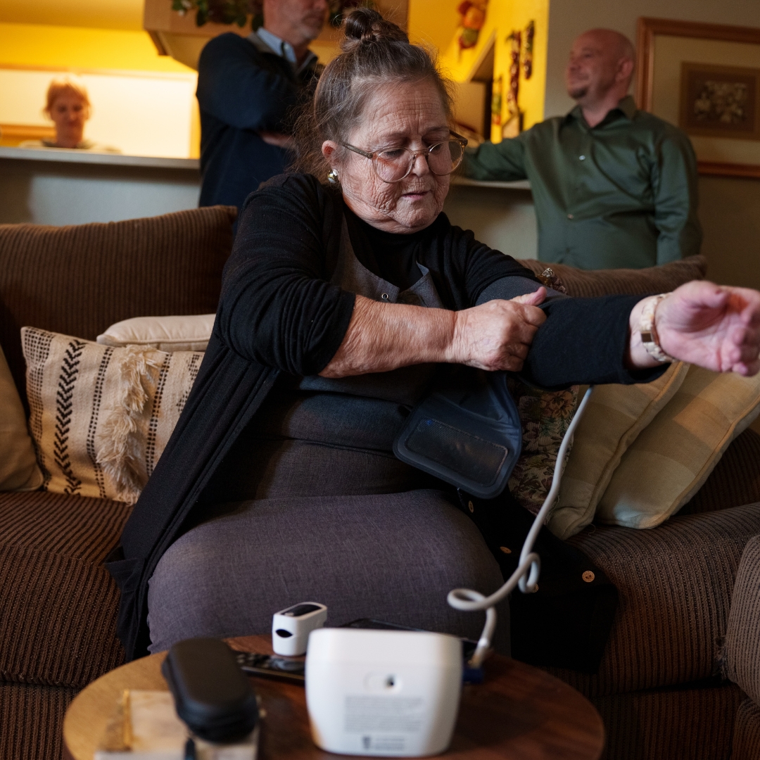 - Cindy checks her blood pressure at home and shares the results with her doctor each day.
